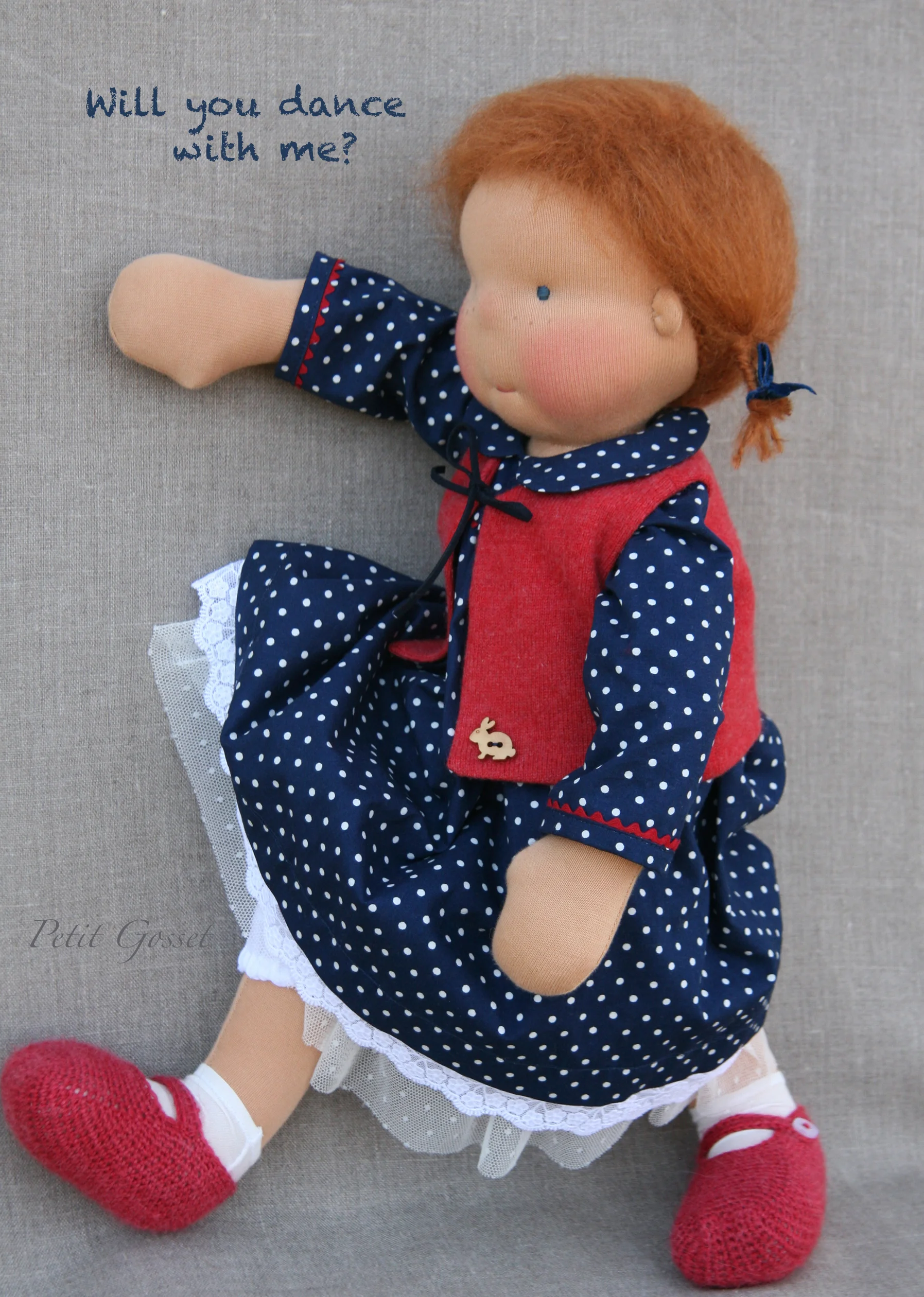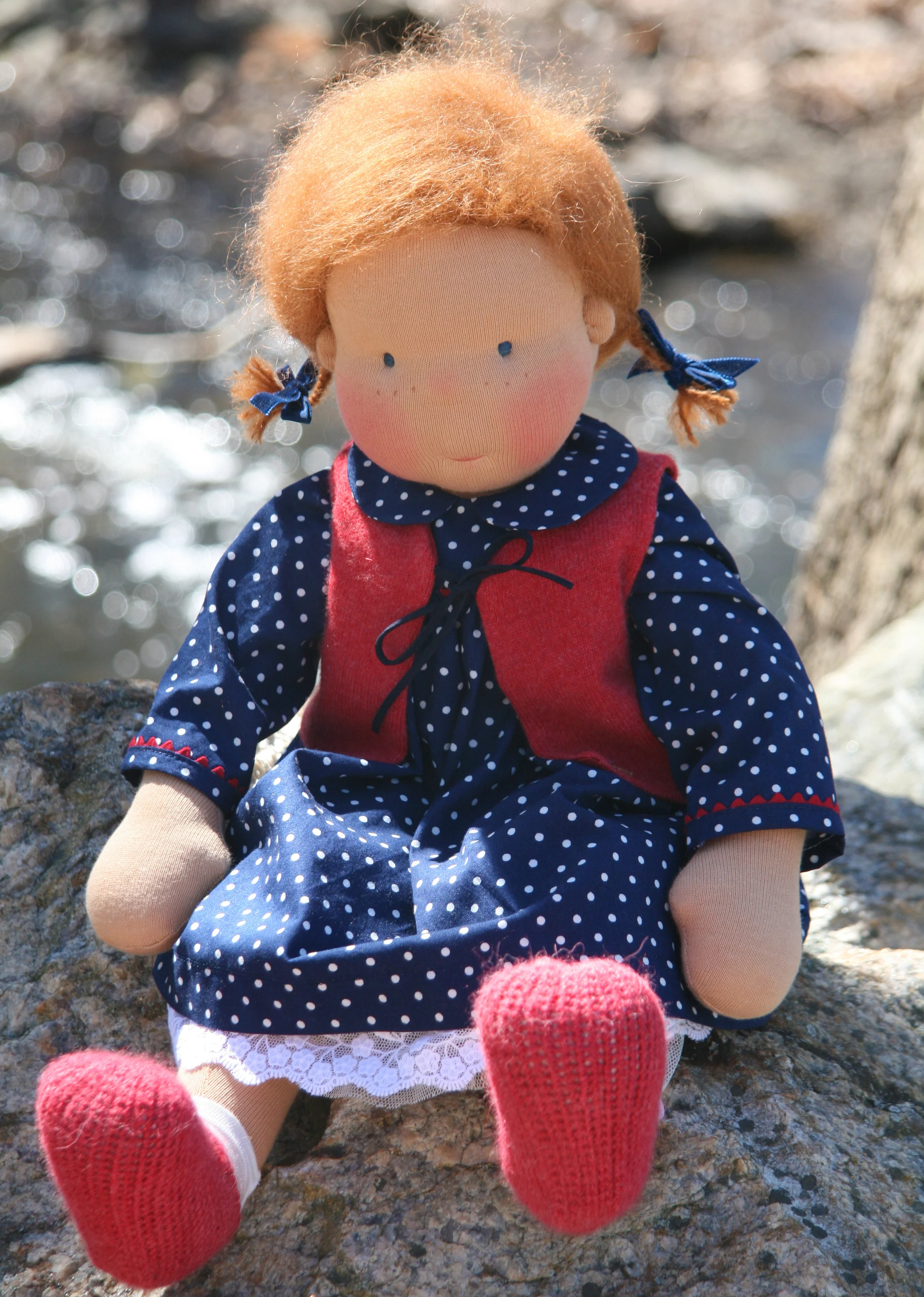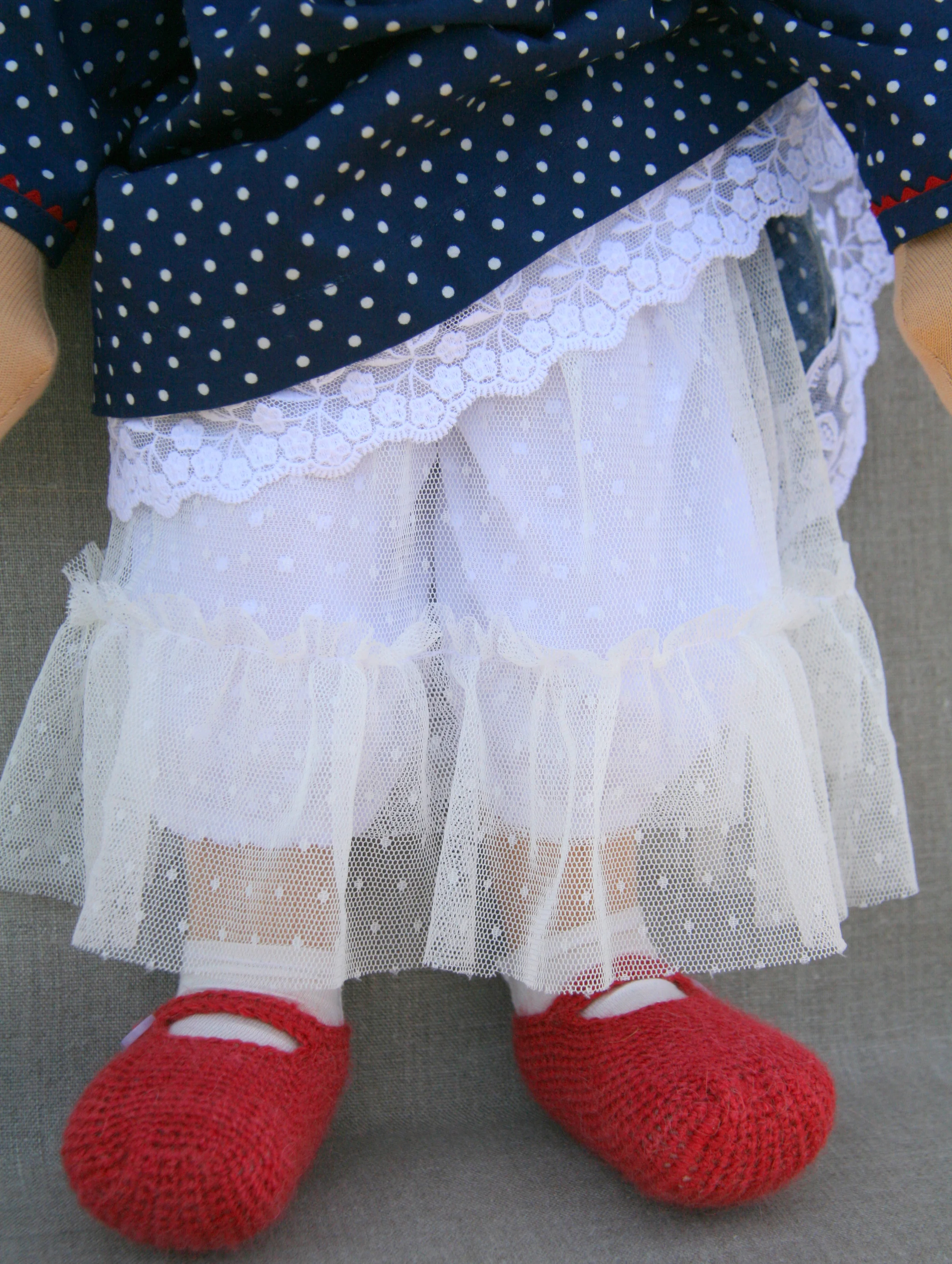Aurélie is a little over 20” long and is made with cotton Swiss jersey and stuffed with eco-wool. Her hair is fluffy mohair crocheted into a wig. She is wearing a cotton dress with puffed long sleeves, French lace for trim, and nickel-free snaps at the back; a pair of Swiss dotted cotton underpants with elastic on legs and waist for a better fit; and a wide ruffled underskirt made with Point d'Esprit Swiss Dot Veiling. Her vest is made with silky soft cashmere knit and lined with cotton. It features suede ties and a wooden button in a rabbit shape for a lovely accent. Her mohair shoes are hand-crocheted.