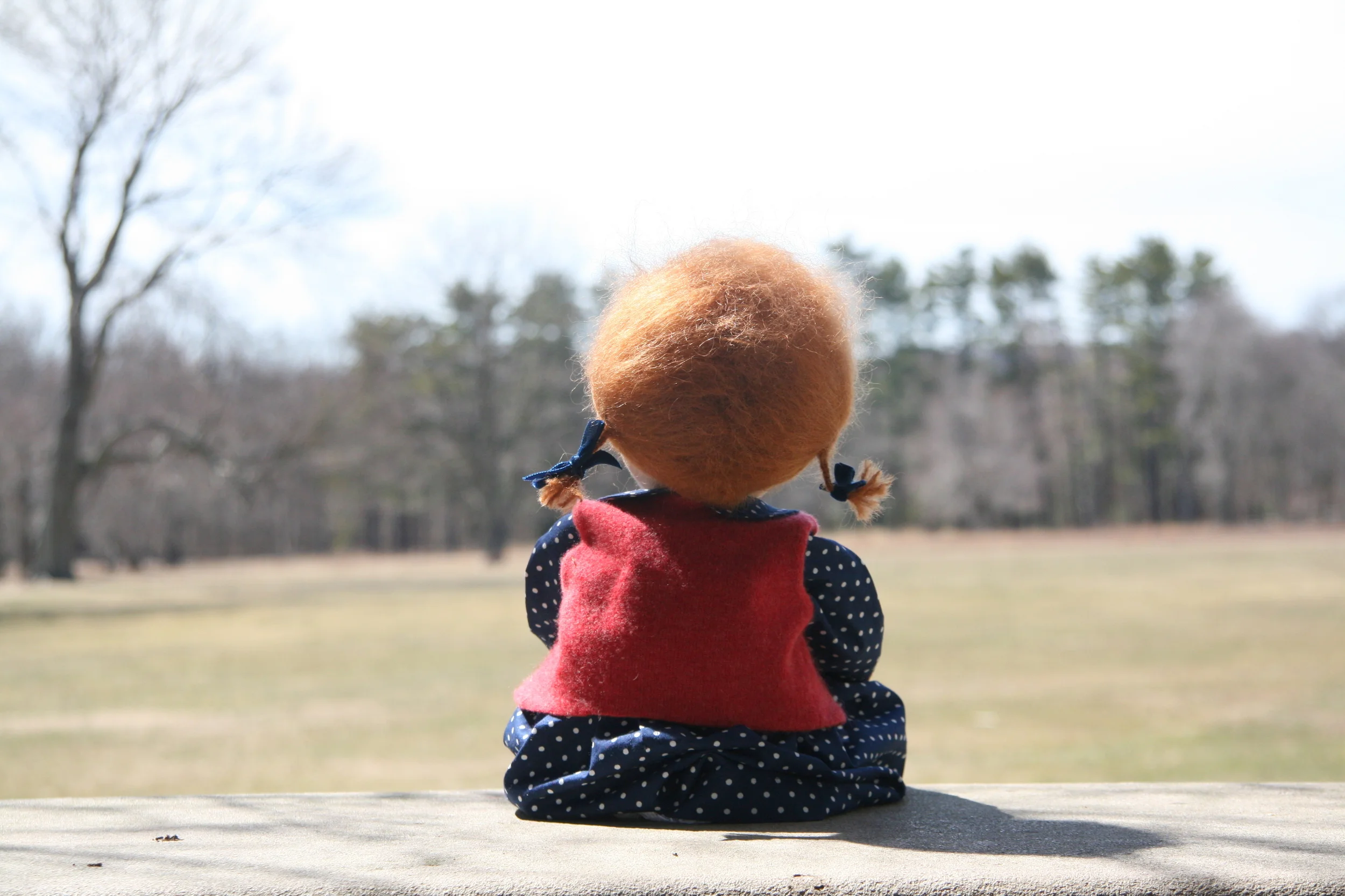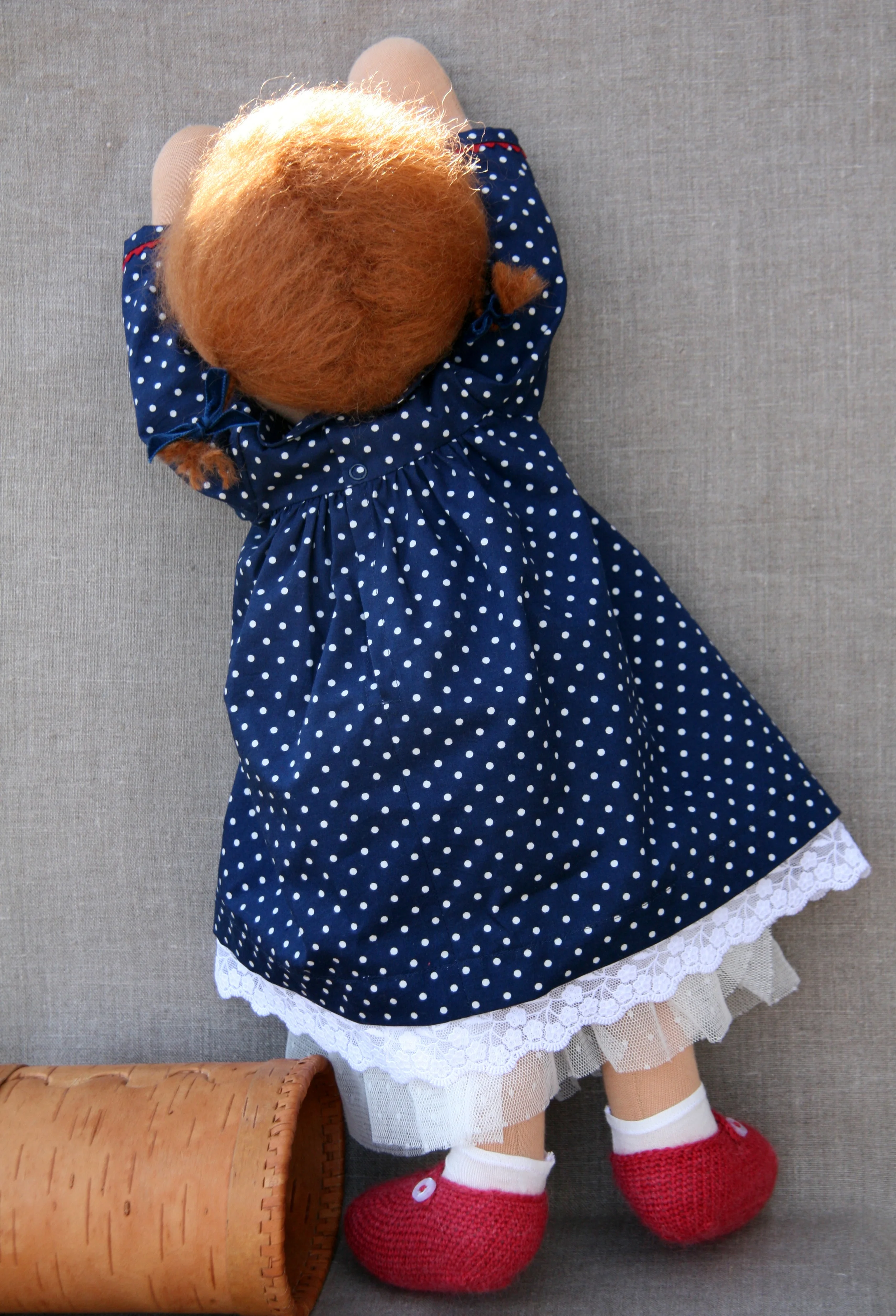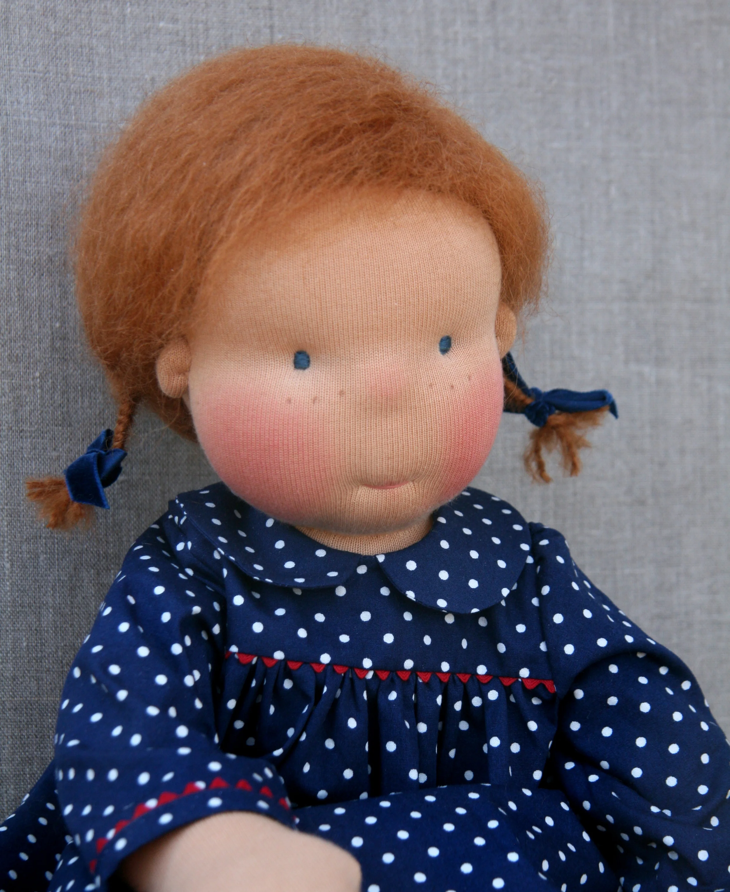 Aurélie is a little over 20” long and is made with cotton Swiss jersey and stuffed with eco-wool. Her hair is fluffy mohair crocheted into a wig. She is wearing a cotton dress with puffed long sleeves, French lace for trim, and nickel-free snaps at the back; a pair of Swiss dotted cotton underpants with elastic on legs and waist for a better fit; and a wide ruffled underskirt made with Point d'Esprit Swiss Dot Veiling. Her vest is made with silky soft cashmere knit and lined with cotton. It features suede ties and a wooden button in a rabbit shape for a lovely accent. Her mohair shoes are hand-crocheted.