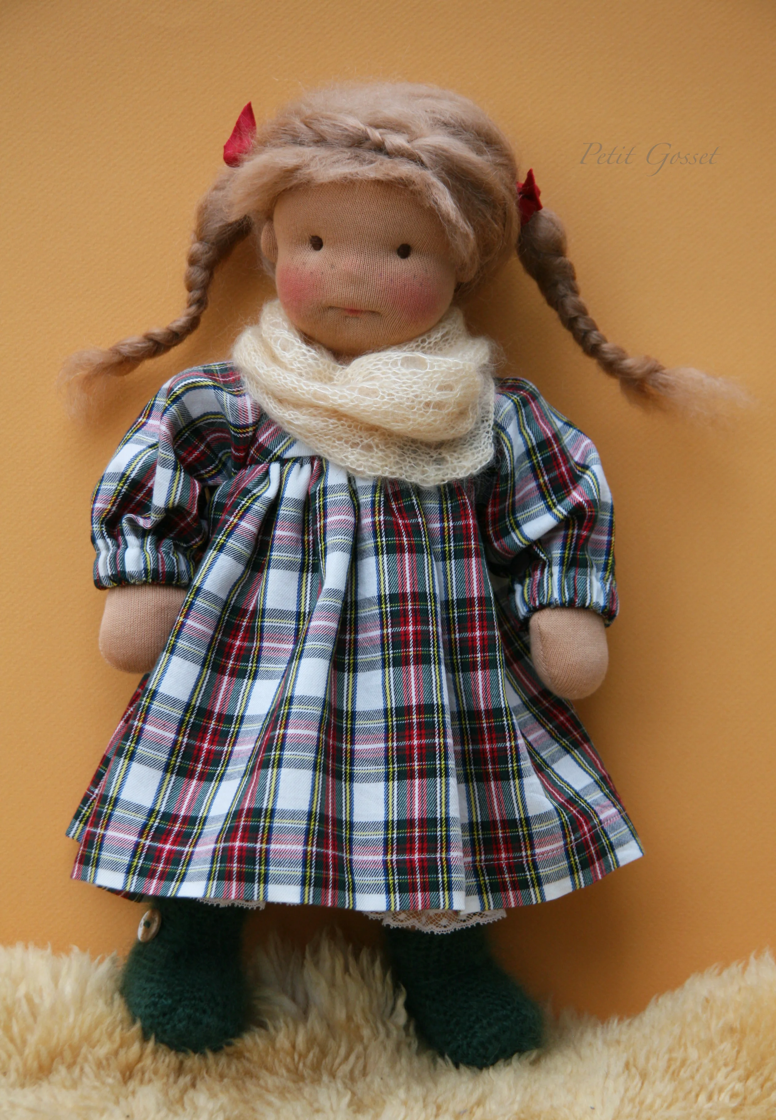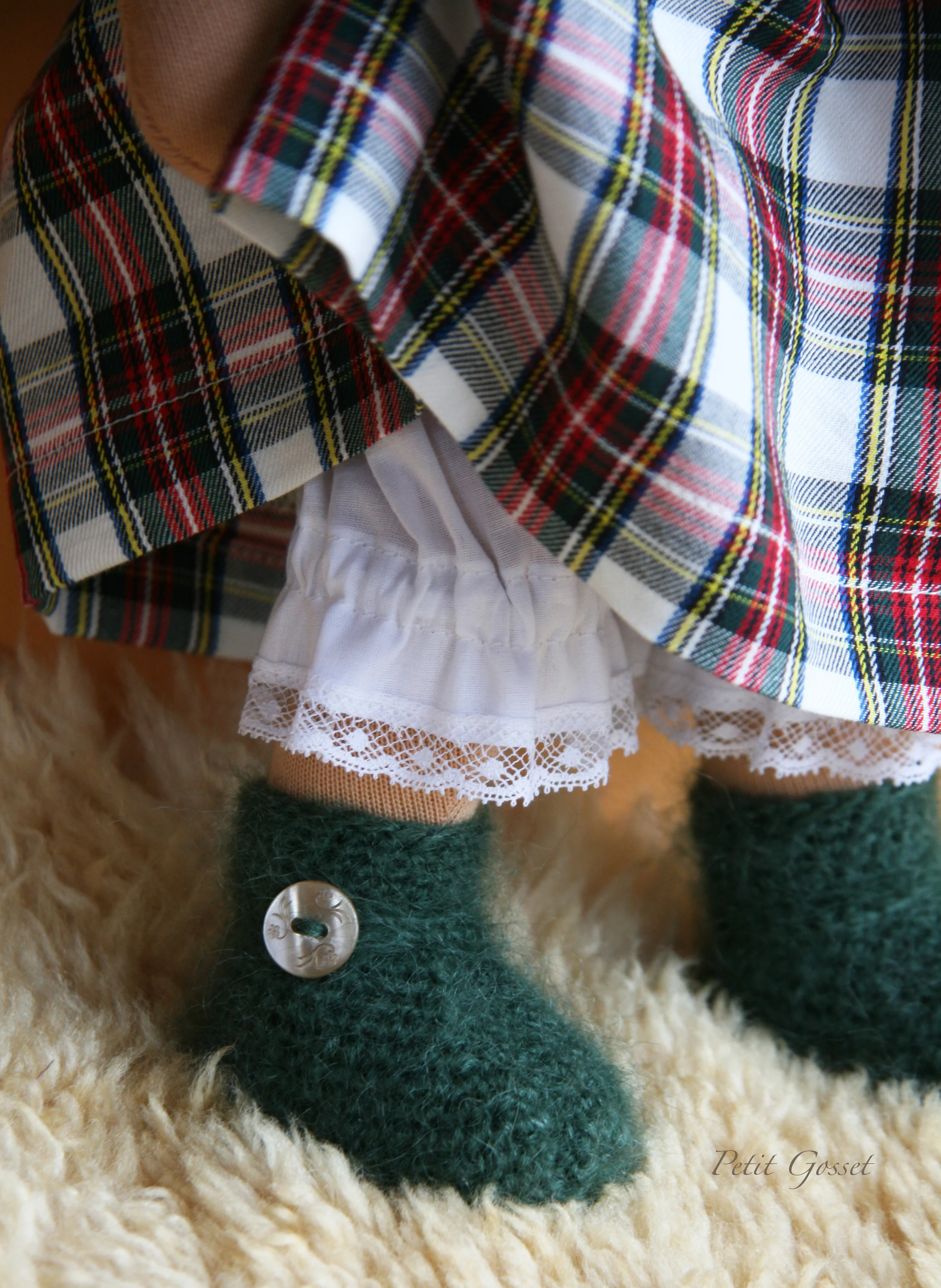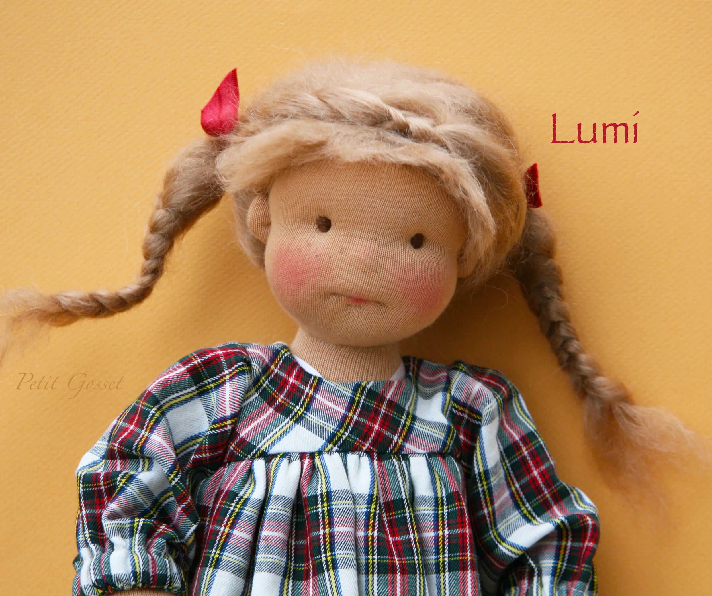 Lumi is about 15" tall. She is crafted with Swiss cotton interlock and stuffed very firmly with sweet-smelling wool. She has a needle-sculpted face and her hair is made with fine alpaca goat mohair weft that has been crocheted into a cap and stitched down to the head. She also has little ears, knees, elbows and a cute bum. Lumi is wearing underwear, made with organic cotton batiste, silk ribbon and beautiful French lace, a festive cotton dress, and a pair of hand-crocheted mohair/silk boots.