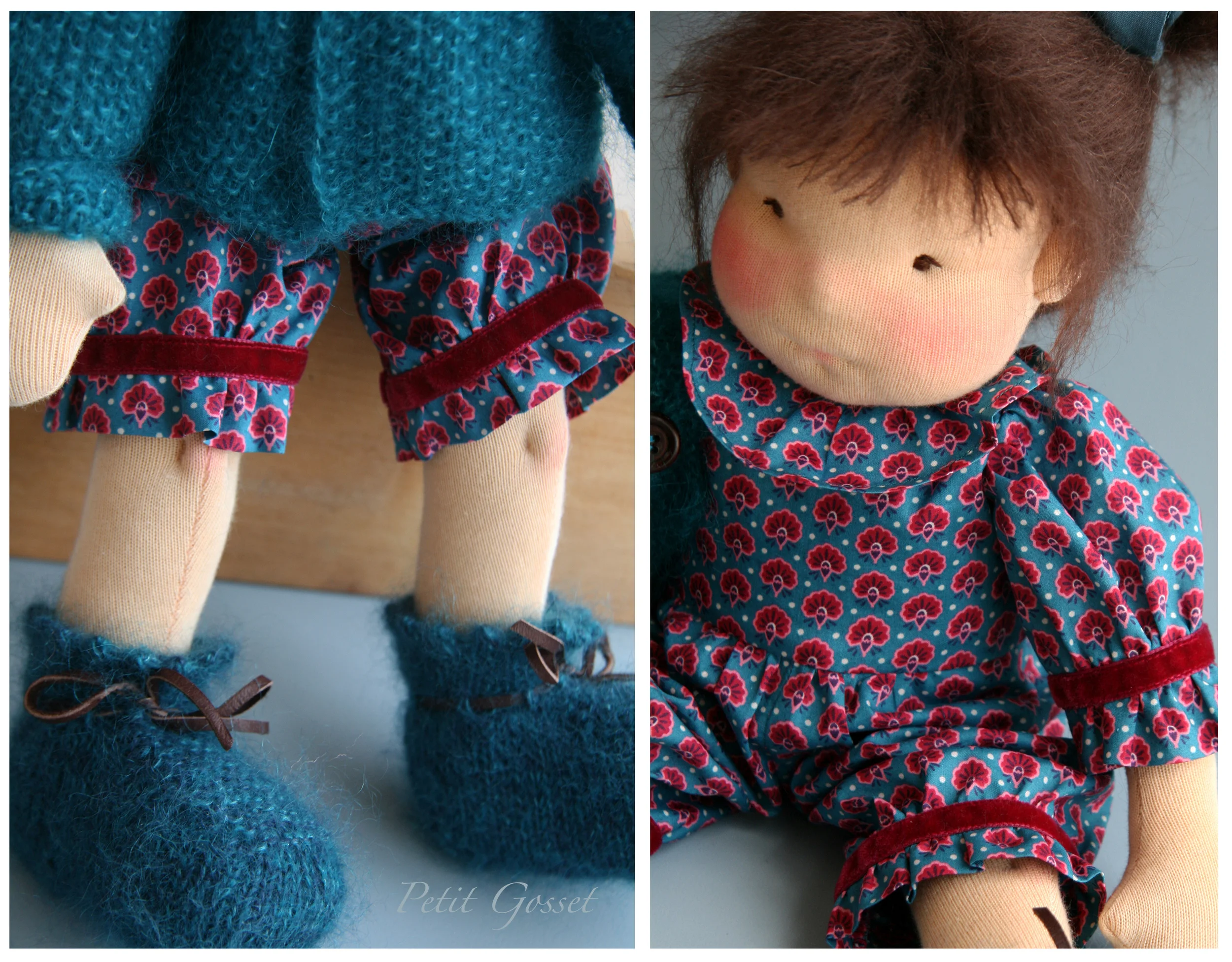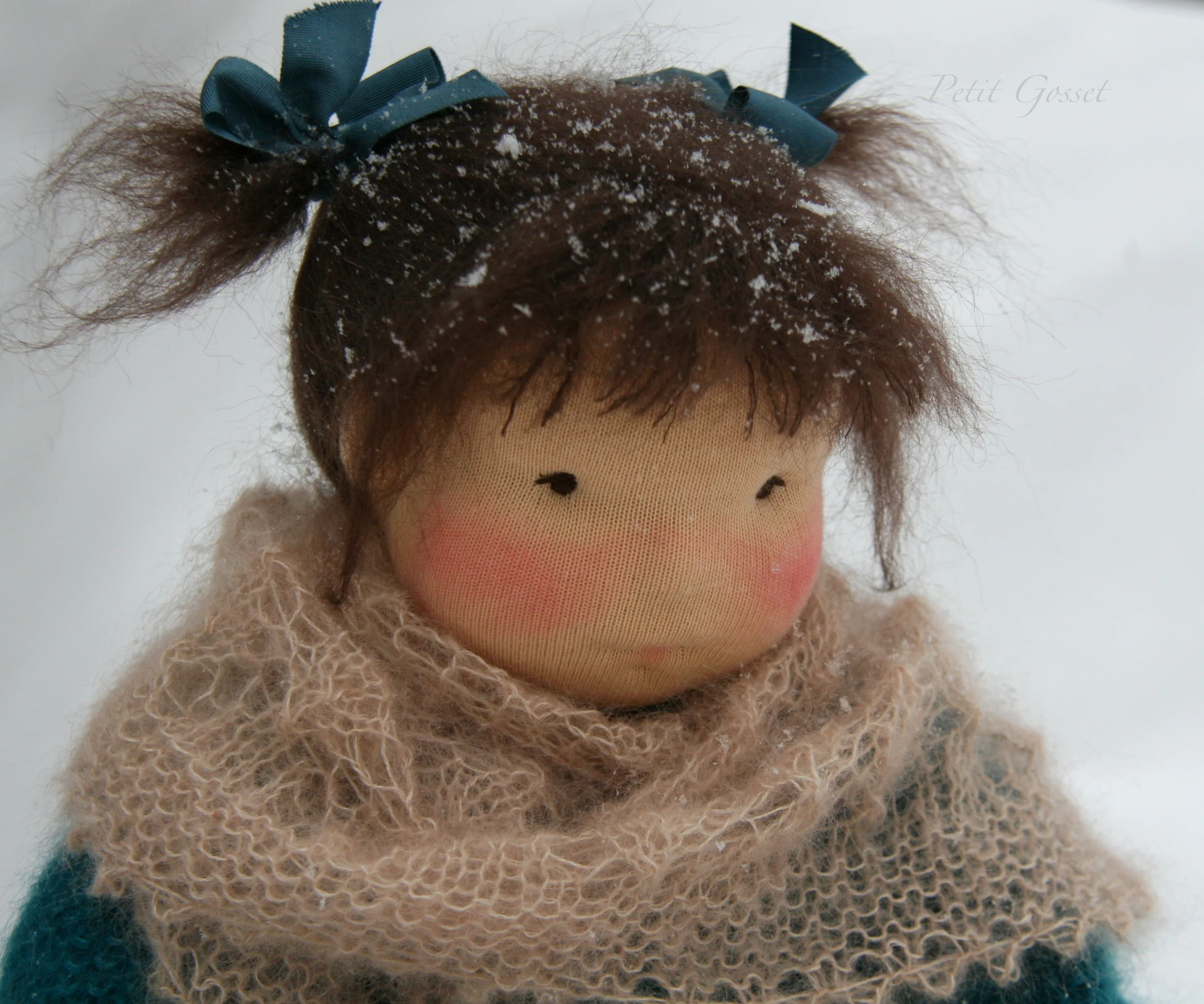 Aiko is an OOAK (One-of-a-kind) 15" doll with fair skin, made with Swiss jersey and stuffed firmly with eco-wool. Her face is sculpted using needle-felting technique and hand embroidered. Her hair is mohair yarn. Aiko also has little ears, knees, elbows and a cute little bum.