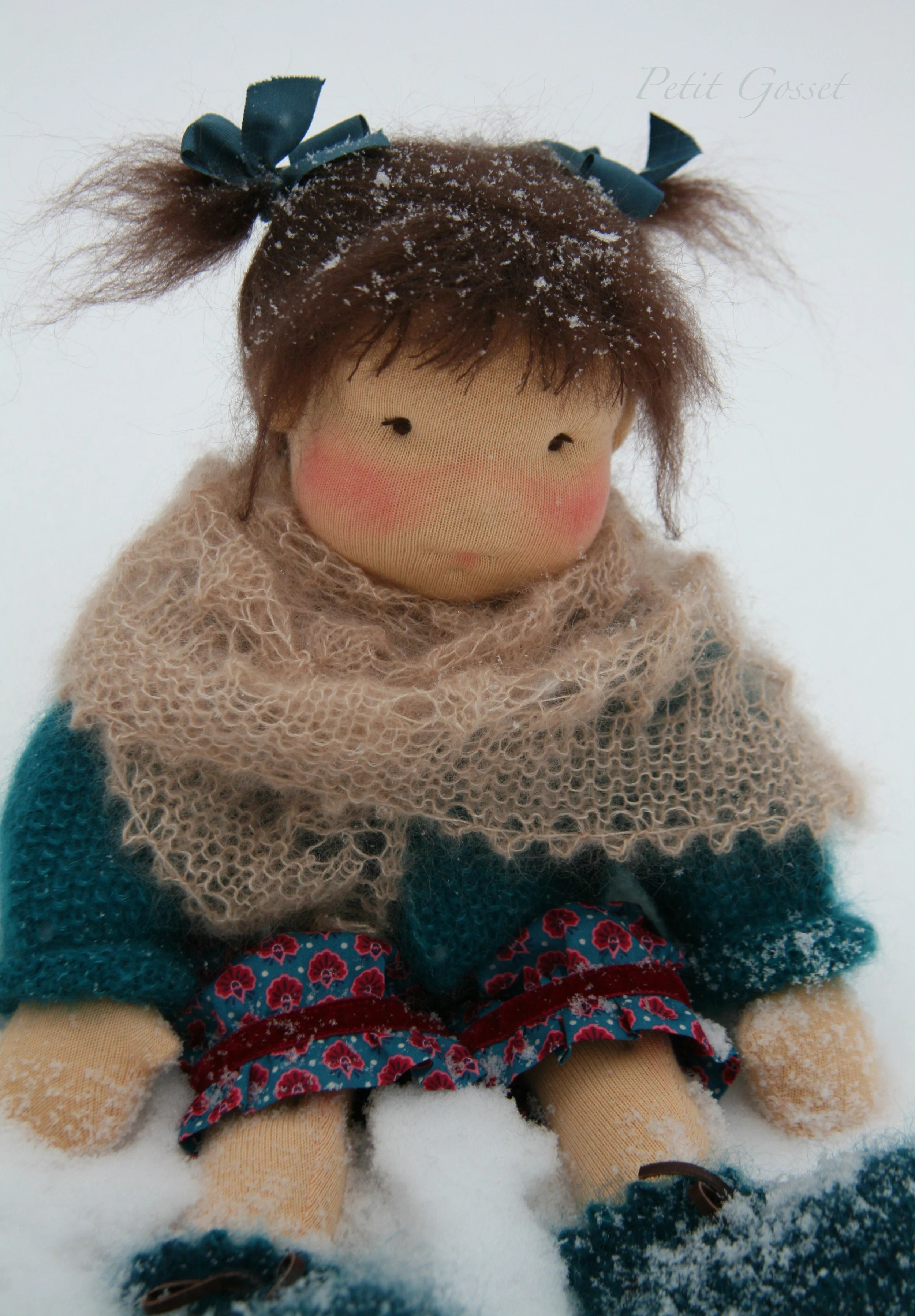 Aiko wears a Liberty print jumper; cotton underwear; a beautiful hand-knitted mohair/silk cardigan with a leather button; a pair of matching boots with leather ties; a gorgeous lace shawl (Hand-knitted with a WinterludesDolls pattern).