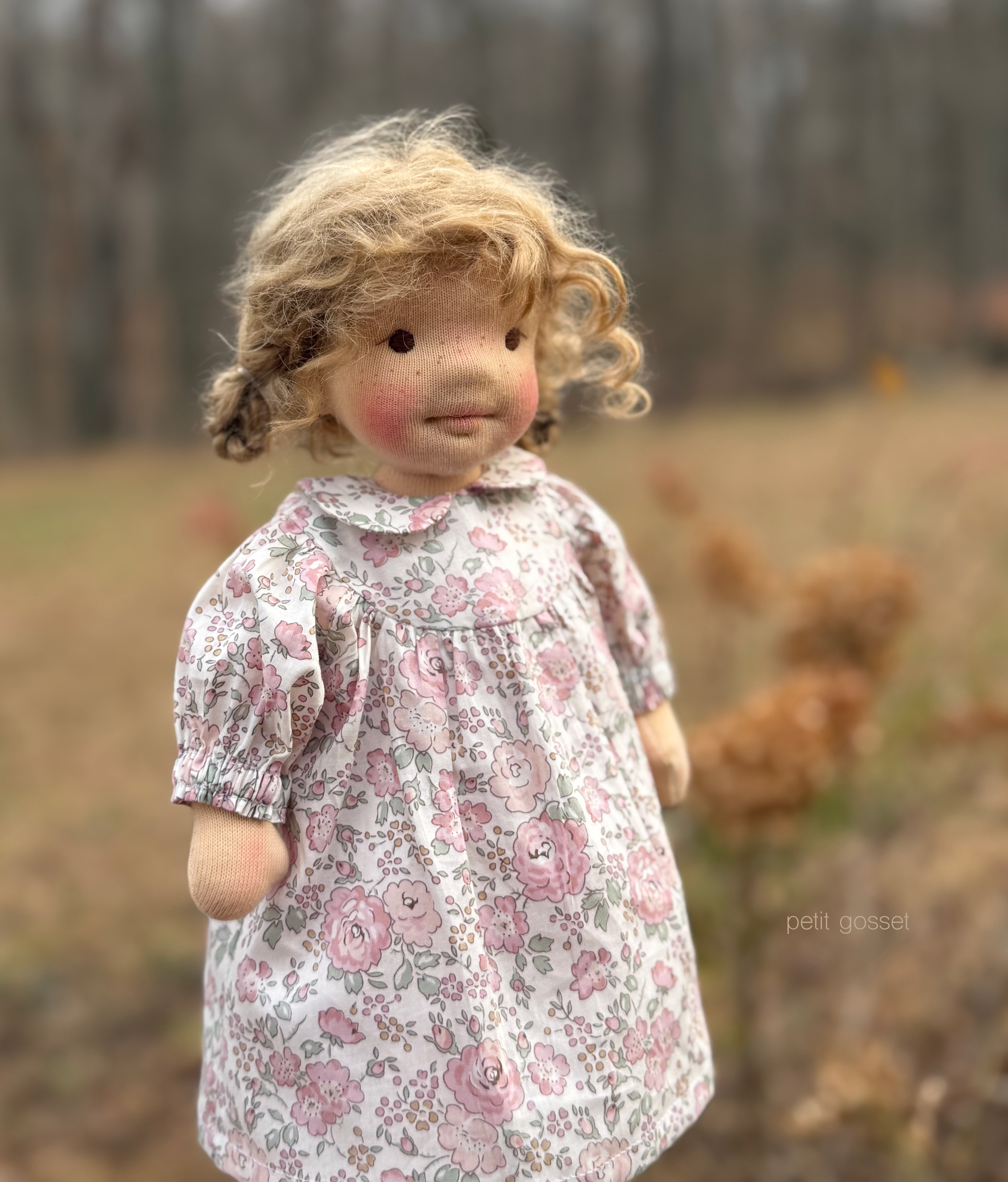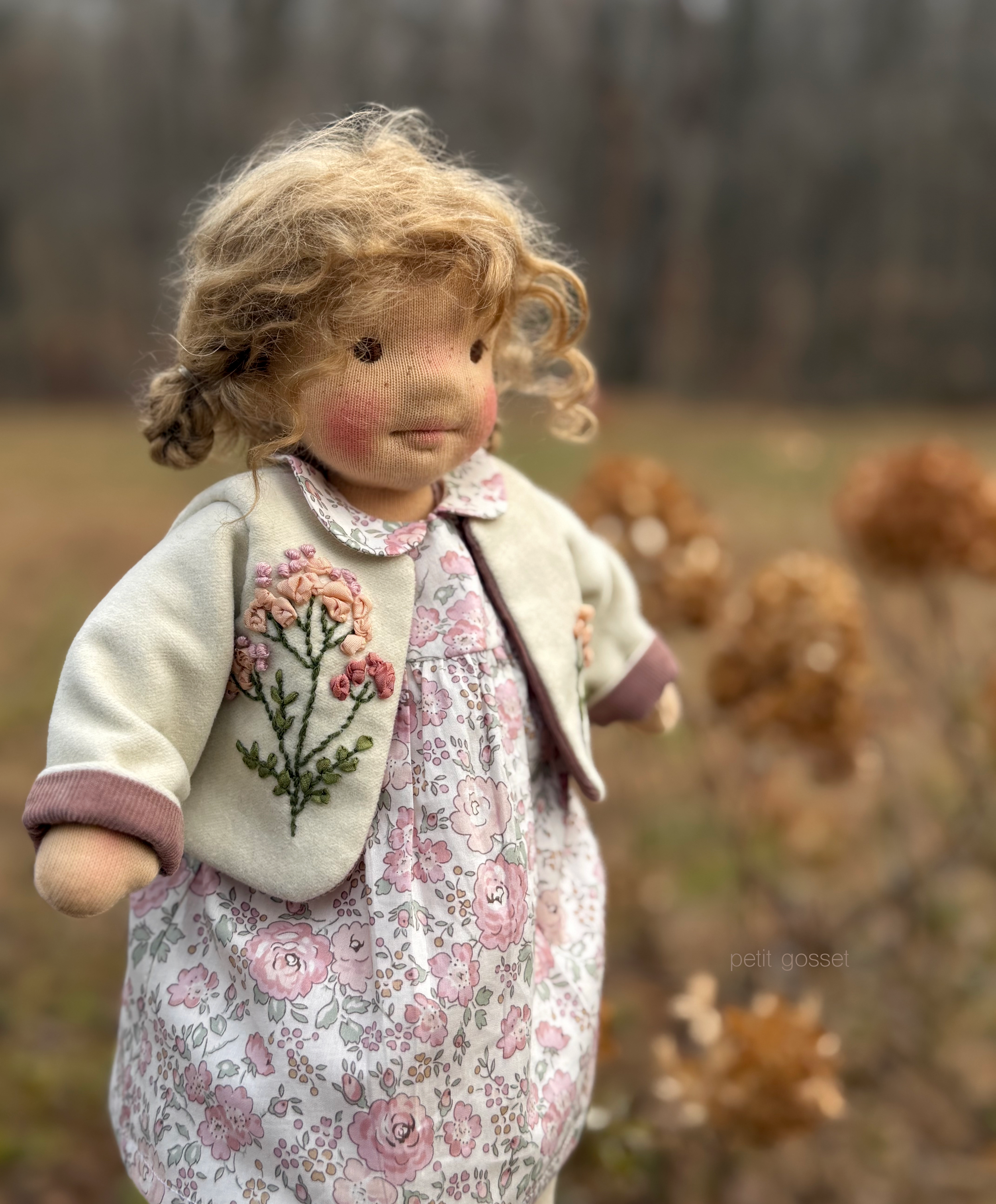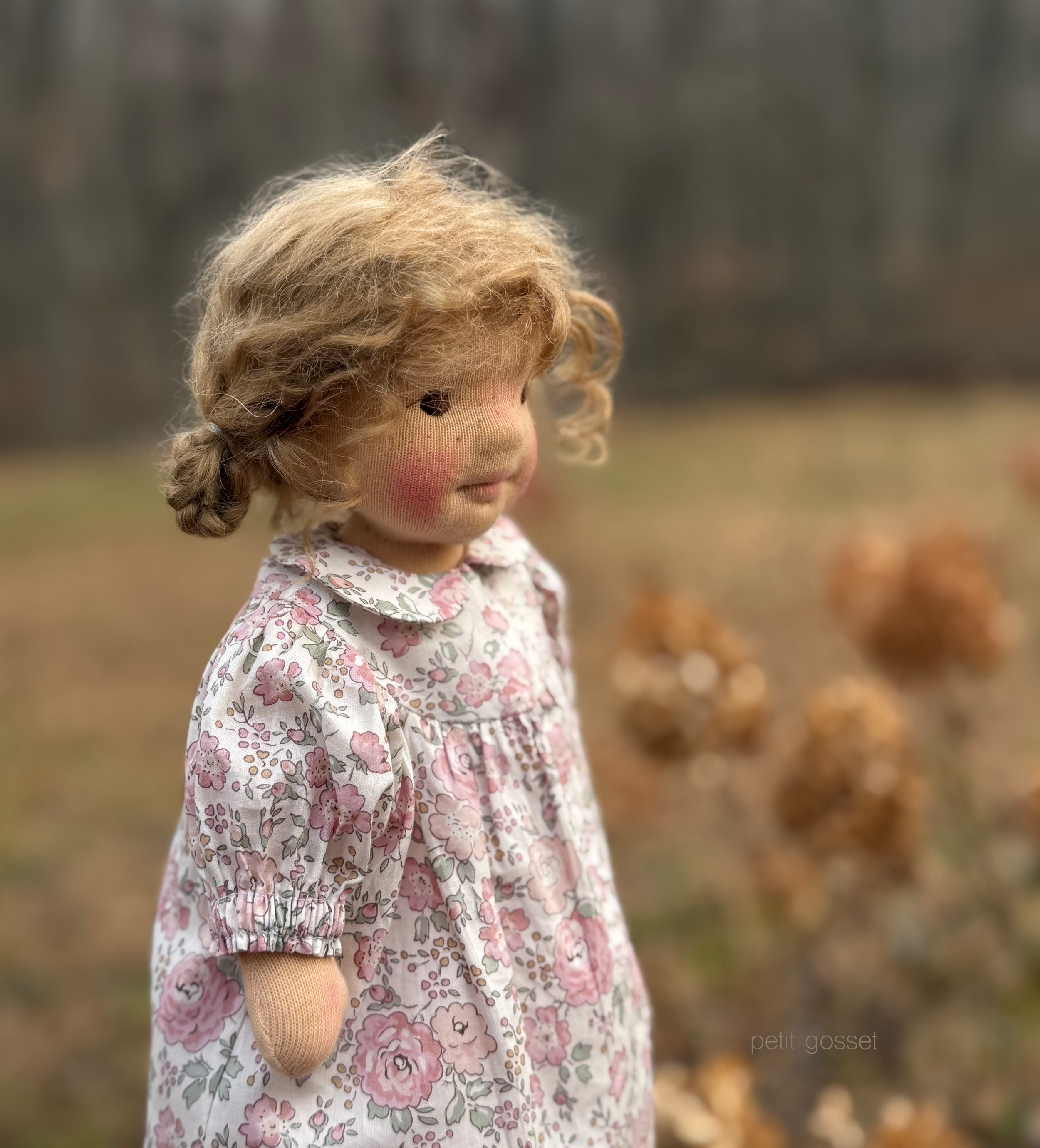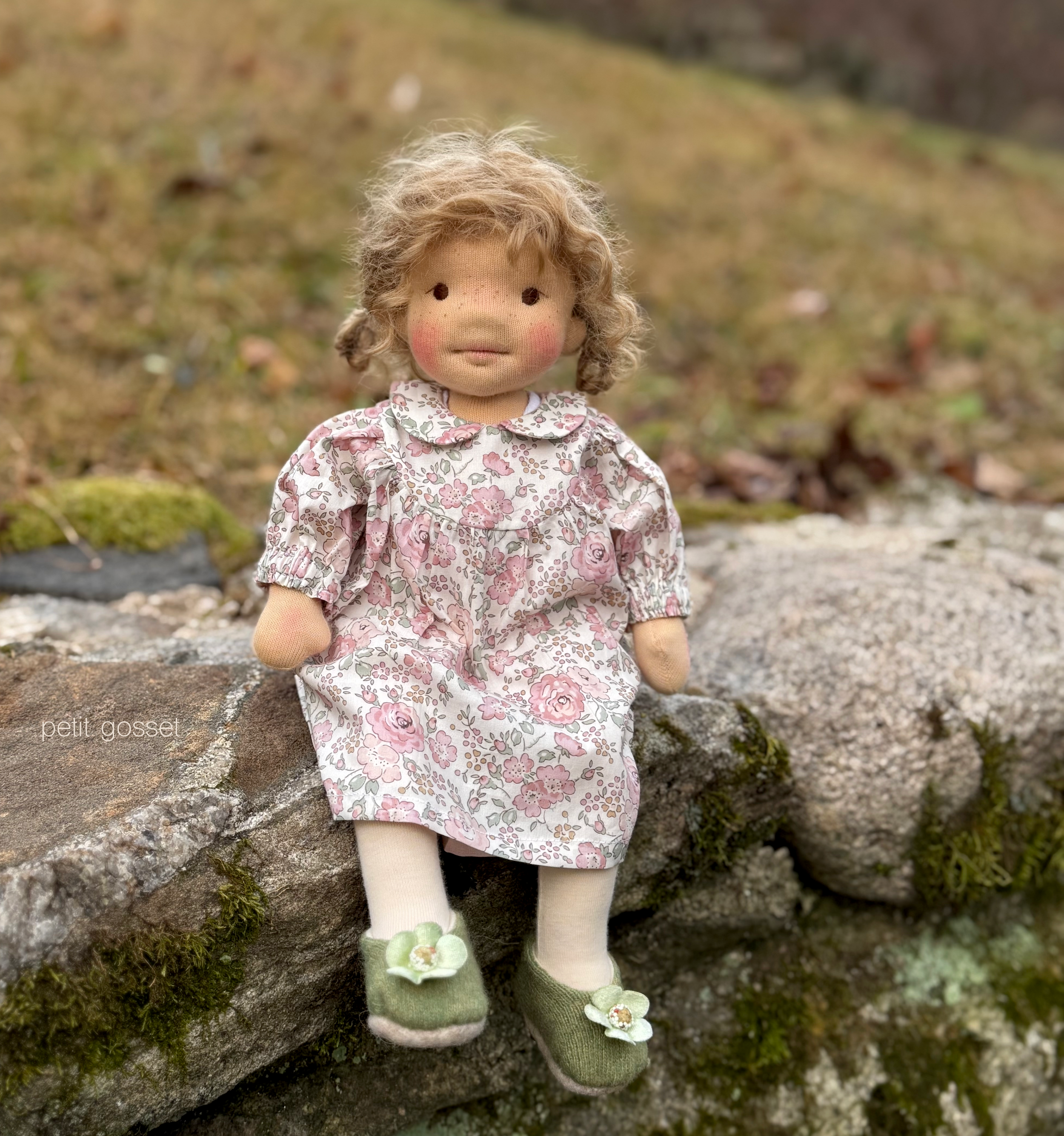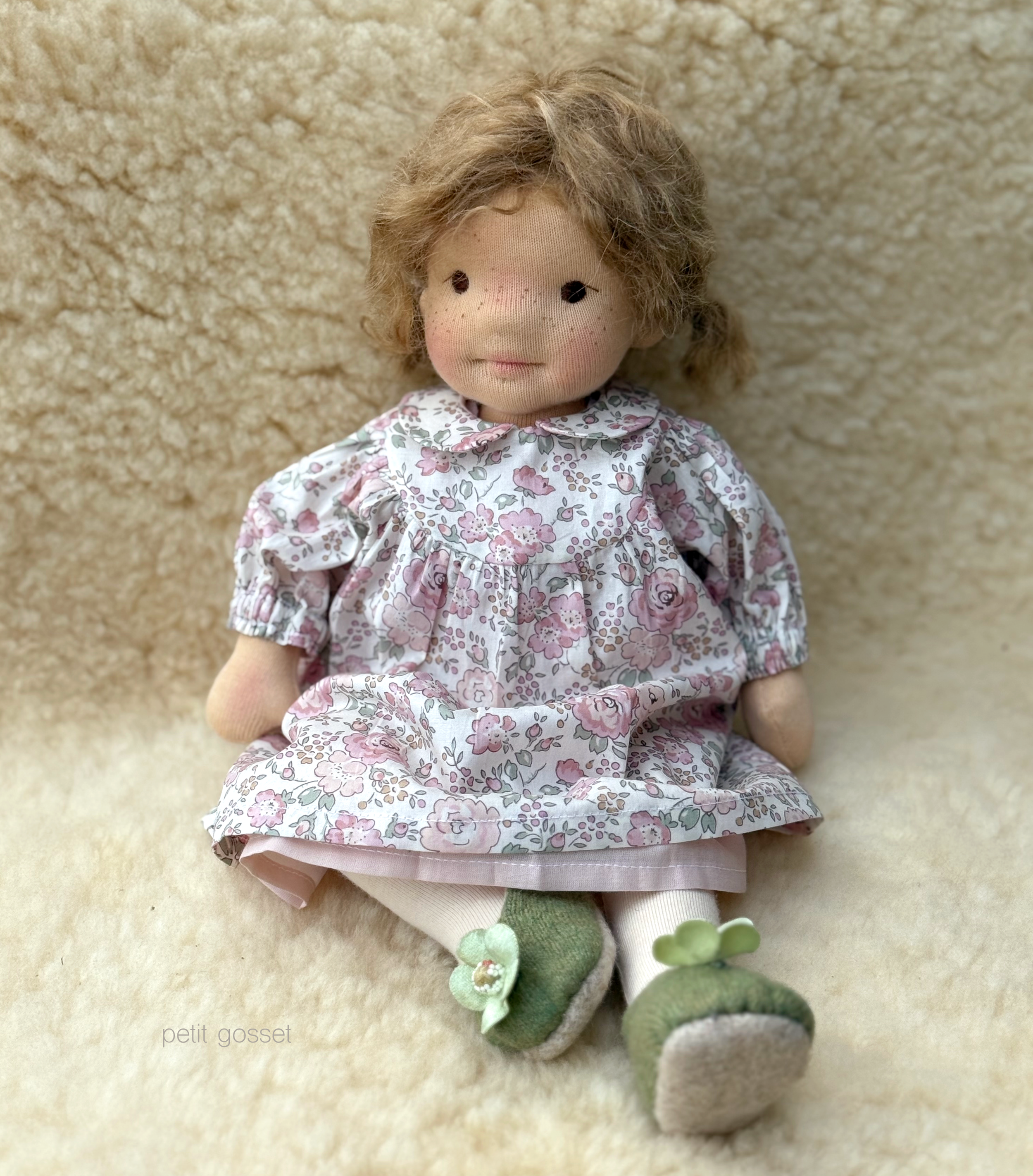 Thalia is a little over 13 inches tall, shaped slowly from natural materials. Her body is filled with soft organic wool, giving her warmth and comforting weight when held, and her skin is made from a special Swiss dollmaking fabric that lends her a quiet, lifelike presence.