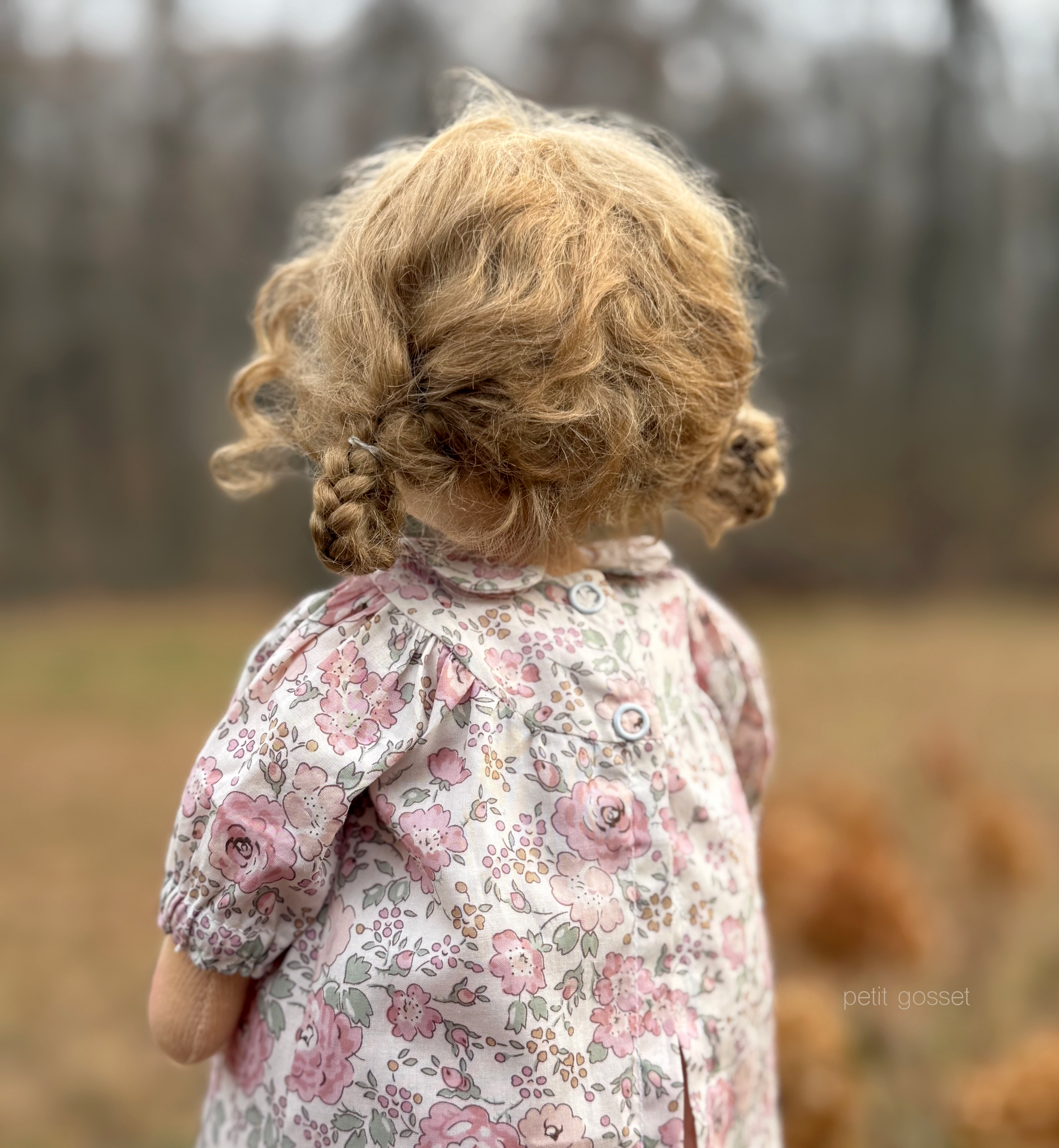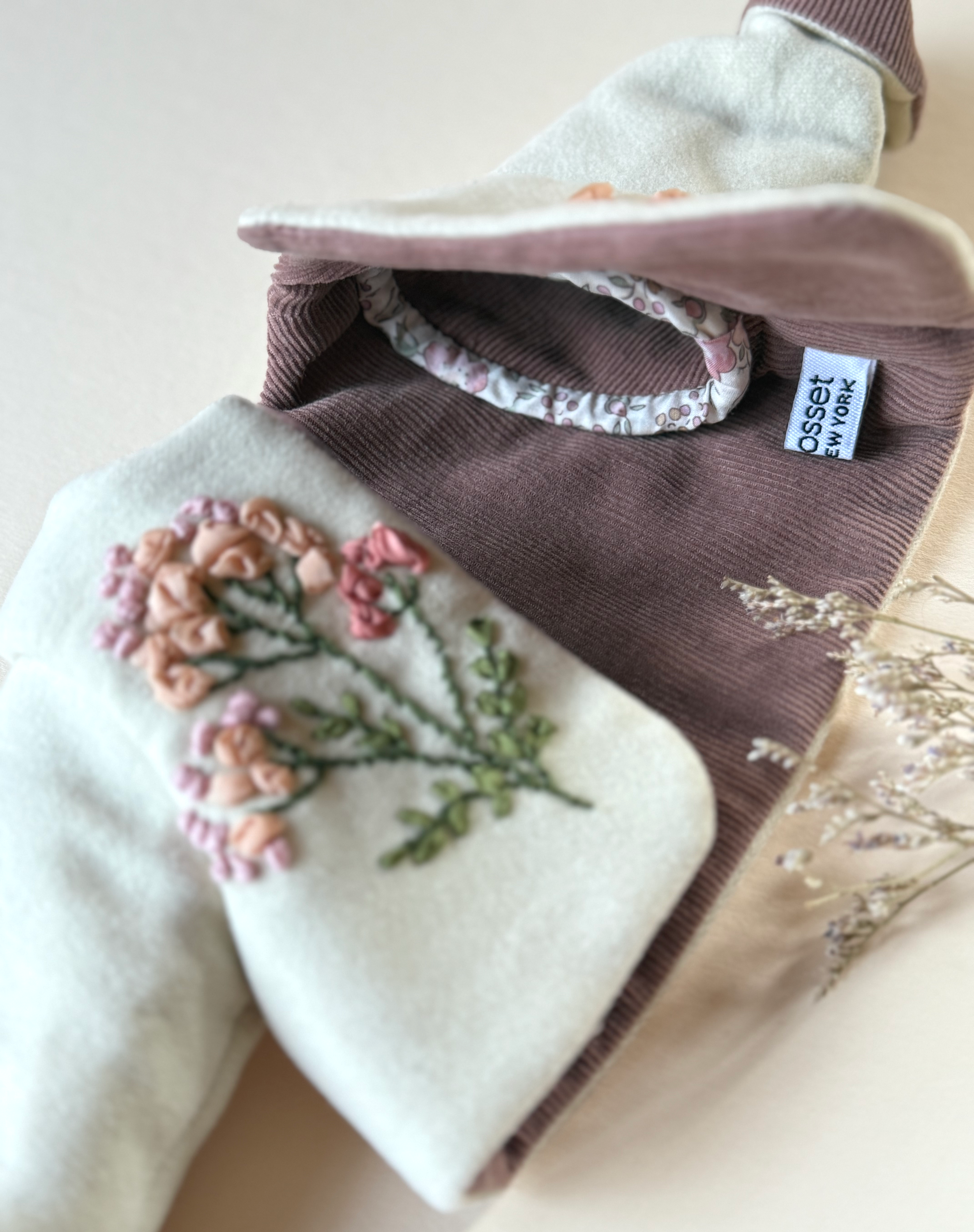 When she travels to her new mum, she will arrive dressed in thoughtful, timeless layers: an organic cotton set of underwear, warm cotton tights, and a light cotton batiste petticoat. Over these, she wears a Liberty dress in subdued florals. Her jacket, crafted from a blend of cotton and cashmere, is finished with small hand-embroidered silk flowers. Her soft cashmere shoes complete the ensemble with the same understated refinement.