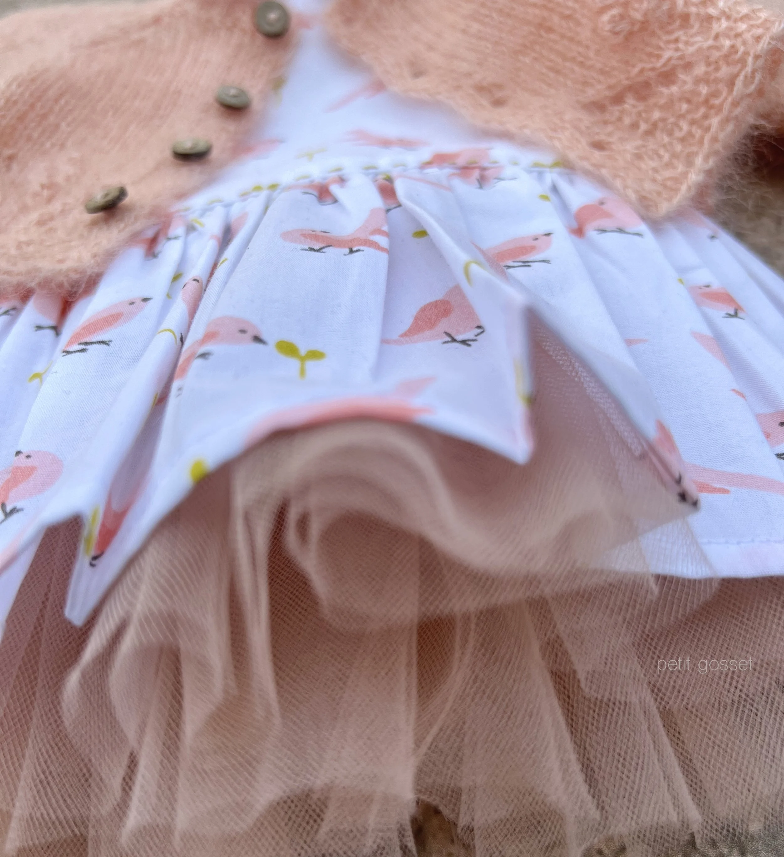 While all three pieces harmonize beautifully when worn together, they’re equally enchanting in pairs: the cardigan with the tulle skirt evokes a ballerina’s grace, while the dress beneath the cardigan creates a sweet, relaxed ensemble.